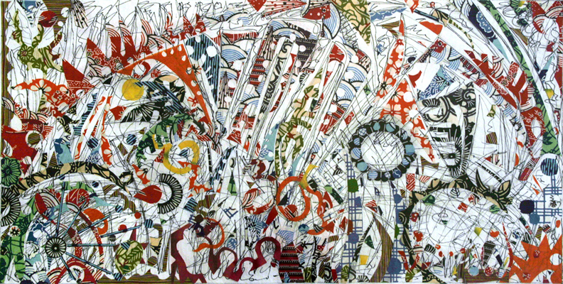 Ink & Collage, Size: 12"x24" This is in the same rhythm as Grass as its size does not limit its space or boundaries. There is excitement in creating a tension between the parts, which in correspondence form their own structure.
