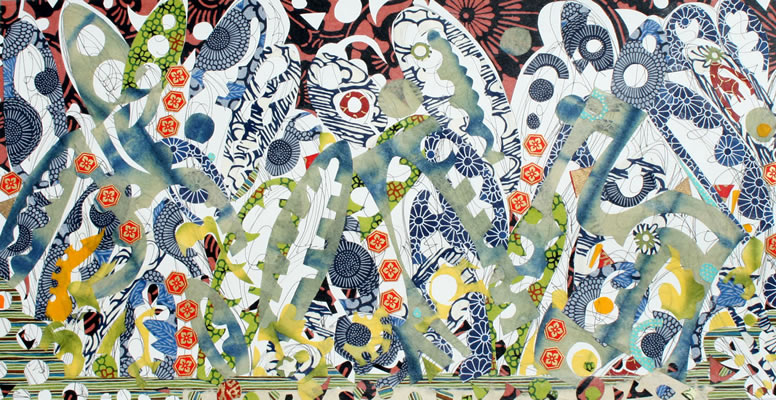Collage, Size: 9"x17½" Following ‘Pond’ this collage came and worked quicker. It reminds me of tide pools and shellfish and molluscs and barnacles and the tide. It also reminds me of ruins…or caves and caverns…or…