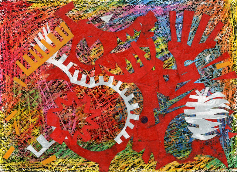 I used oil pastels in this series and then, hand made and other, papers were collaged over the background with acrylic medium.
